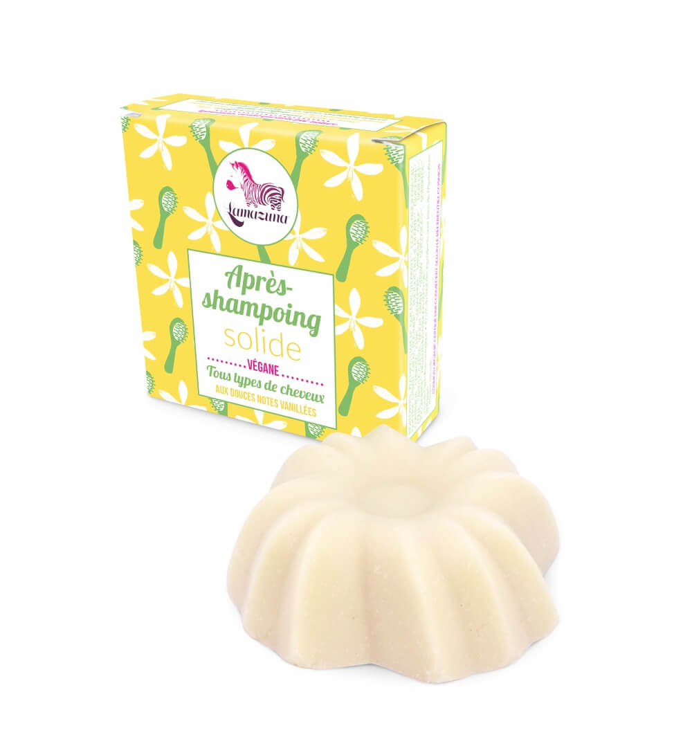 Modo de utilização: Lave o cabelo, retire o excesso de água e aplique uma pequena quantidade no comprimento dos fios e pontas, com os dedos ou diretamente com o condicionador sólido. De seguida, basta enxaguar.